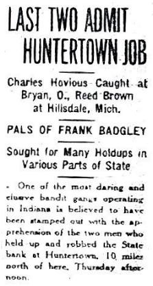 Charles Hovious, who is in jail at Bryan, O., and his confederate Reed Brown, alias Russell Clark, in prison at Hillsdale Mich., are the last known members of the notorious Frank Badgley gang. Apprehension of the two fugitives came after a long chase on many side roads, across fields and through swamps of Indiana, Ohio and Michigan, under the direction of Sheriff A. Guy Emrick of Allen county.